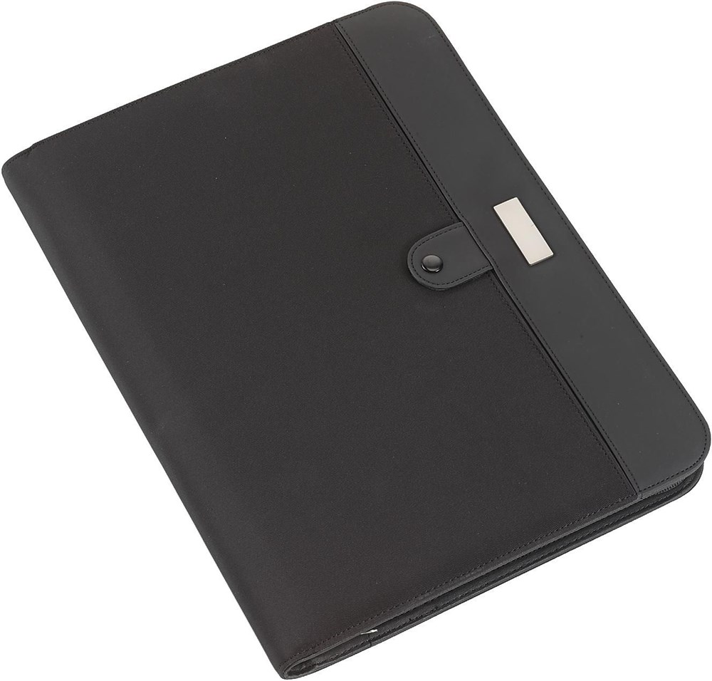 Dokumentenmappe aus Mikrofaser, ca. DIN A4-Format, mit Reißverschluss, integriertem Dual-Power-Taschenrechner mit 8 Ziffern, 7 Einsteckfächern, 3 Stifthaltern (ohne Stifte) und Schreibblock (liniert).