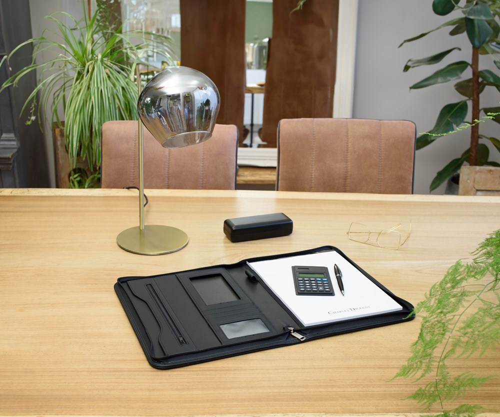 Charles Dickens Dokumentenmappe aus Kunstleder, ca. DIN A4-Format, mit 6 Einsteckfächern, Schreibblock, Taschenrechner und Metallplätchen für Gravuren, verpackt in einer Non-Woven Tasche und Geschenkbox (Lieferung ohne Stift).
