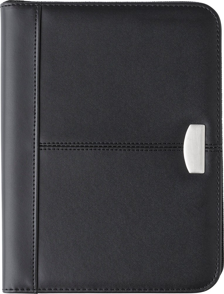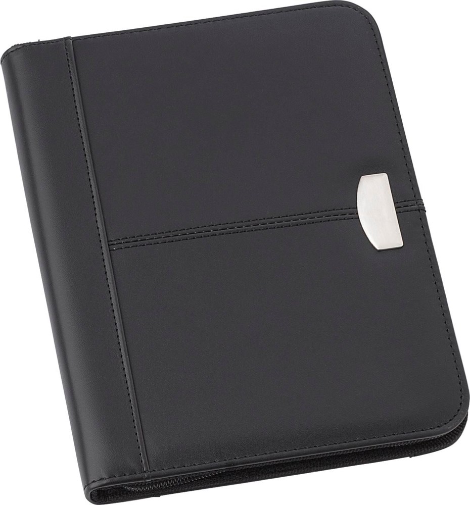Dokumentenmappe aus Kunstleder, ca. DIN A5-Format, mit Reißverschluss, 8 Einsteckfächern, Stifthalter (ohne Stift), Schreibblock (liniert) und Metallplätchen für Gravuren.