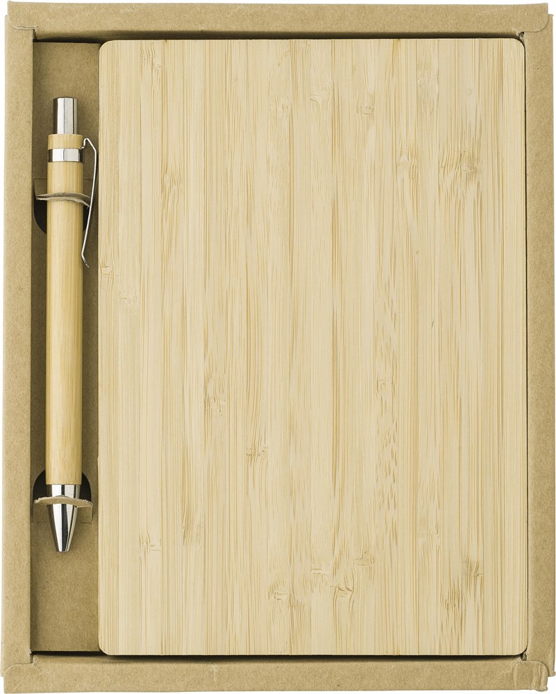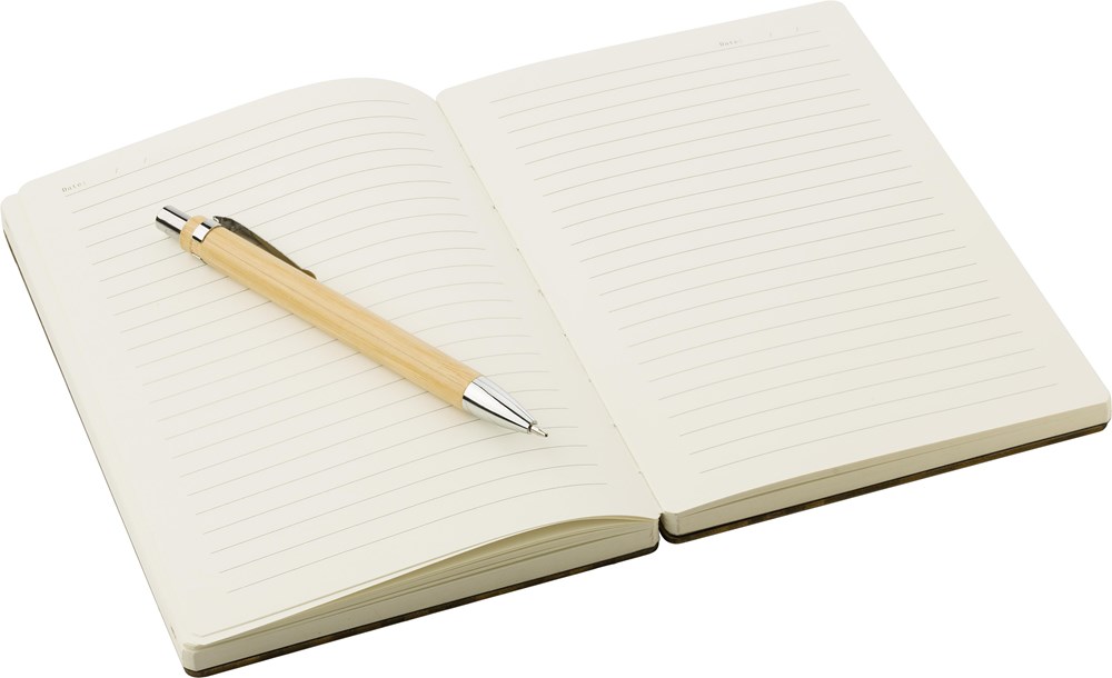 Notizbuch mit Bambuseinband. Verpackt in einer braunen Geschenkbox. Beinhaltet zudem den Bambus-Stift 3804. Das Notizbuch enthält 128 Blatt linierte Seiten.