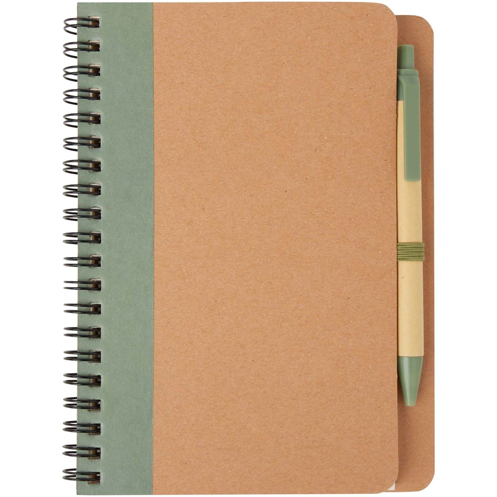 Notizbuch mit Deckel aus Recyclingkarton, 60 Blatt liniertem Recyclingpapier und passendem Stift. Das Notizbuch und der Stift sind zusammen verpackt.