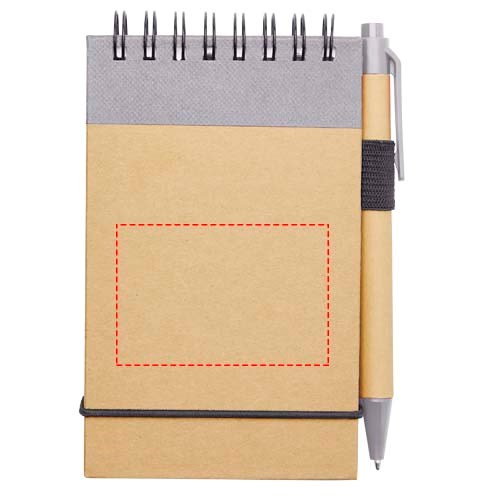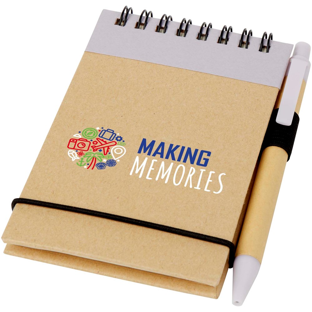 Mit dem Zuse Recycling-Notizblock mit farblich passendem Stift lassen sich schnell Ideen notieren. Der kleine Notizblock enthält 60 linierte Blätter aus A7 Recyclingpapier, passt also in jede kleine oder große Tasche, liegt gut in der Hand und ist vor allem nachhaltig. Verschiedene Druckoptionen stehen zur Verfügung, um ein beliebiges Logo auf der Außenseite des Hardcovers anzubringen.