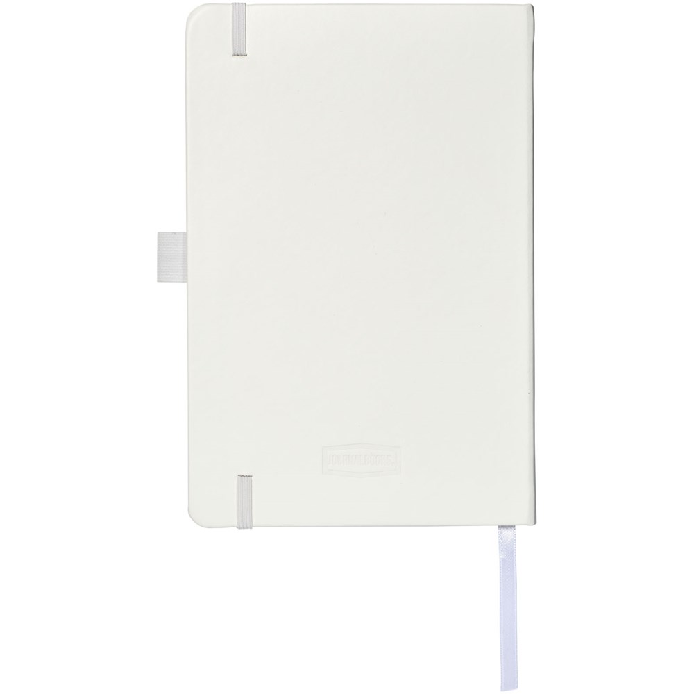 Kunstleder-A5-Notizbuch (14,2 x 21,4 cm, Lederimitat) mit Gummiband, Farbband, Stiftschlaufe und Akkordeon-Tasche an der Rückseite. Enthält 96 Blätter cremefarbenes Papier in 80 g/m2 und wird in einem Journalbook mit weißer Hülle angeboten.