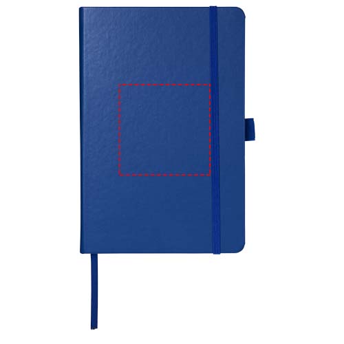 Kunstleder-A5-Notizbuch (14,2 x 21,4 cm, Lederimitat) mit Gummiband, Farbband, Stiftschlaufe und Akkordeon-Tasche an der Rückseite. Enthält 96 Blätter cremefarbenes Papier in 80 g/m2 und wird in einem Journalbook mit weißer Hülle angeboten.