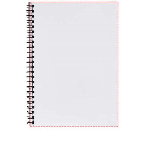 Dieses A5 Notizbuch enthält einen weißen oder schwarzen Draht, 80 g/m2 Blankopapier und eine glänzende Vorder- und Rückseite aus Karton (250 g/m2). Das Standardmodell wird mit 50 Blatt geliefert, aber das Notizbuch ist auch mit 80 Blatt erhältlich. Bedruckung ist sowohl auf den Blättern als auch auf der Vorder- und Rückseite möglich.