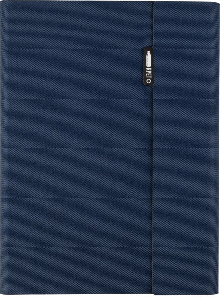 rPET-Mappe (ca. A5) mit verschweißter Oberfläche. Enthält ein Notizbuch mit 64 linierten Seiten (70 g/m²), mehrere Fächer, einen Telefonhalter und einen Magnetverschluss. Einzeln verpackt in einer Kraftpapier Hülle.