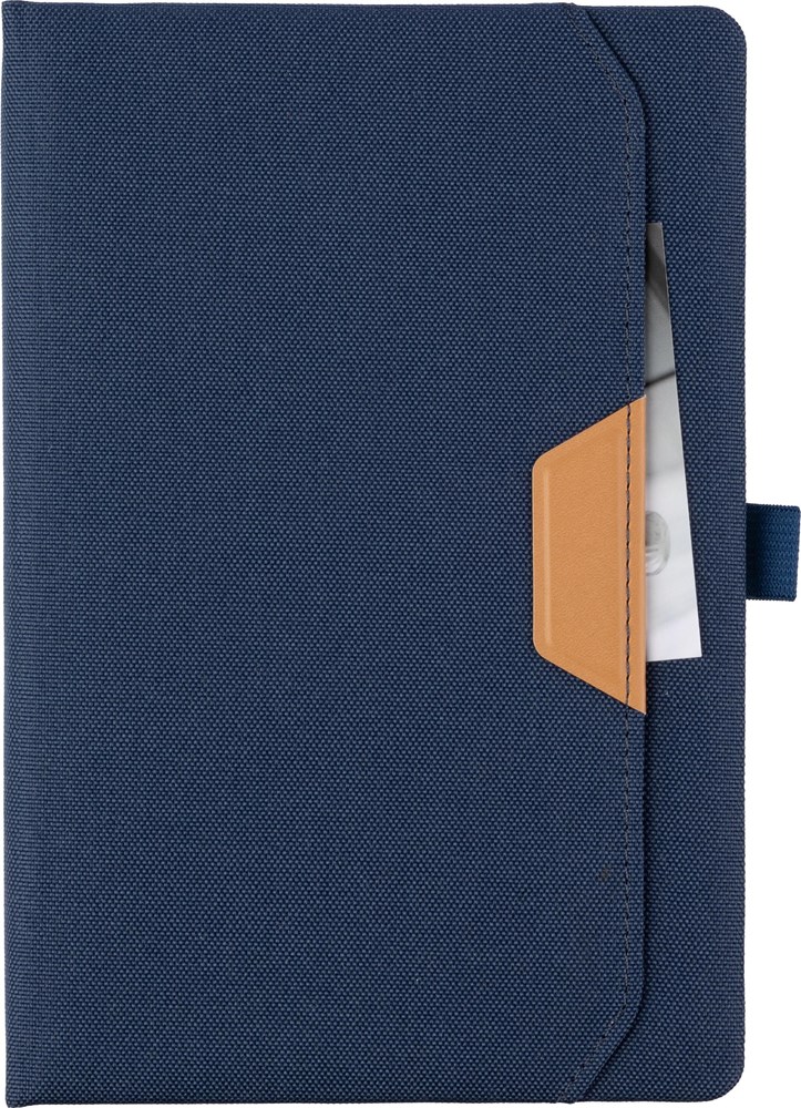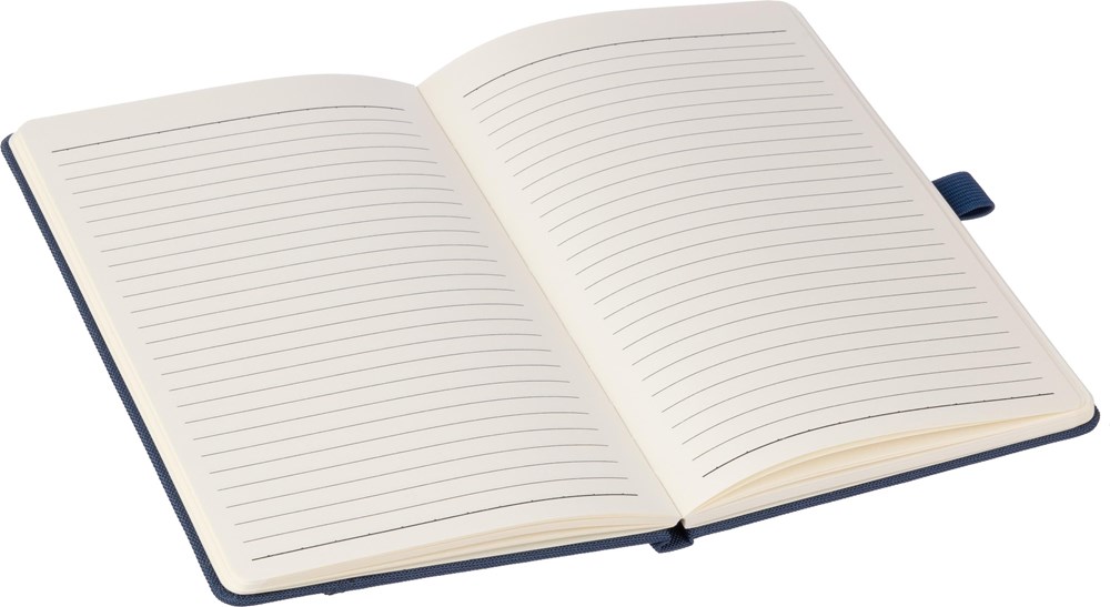 Notizbuch aus rPET (ca. A5) mit PU-Detail und 100 linierten Seiten (80gsm). Einzeln in Seidenpapier verpackt.