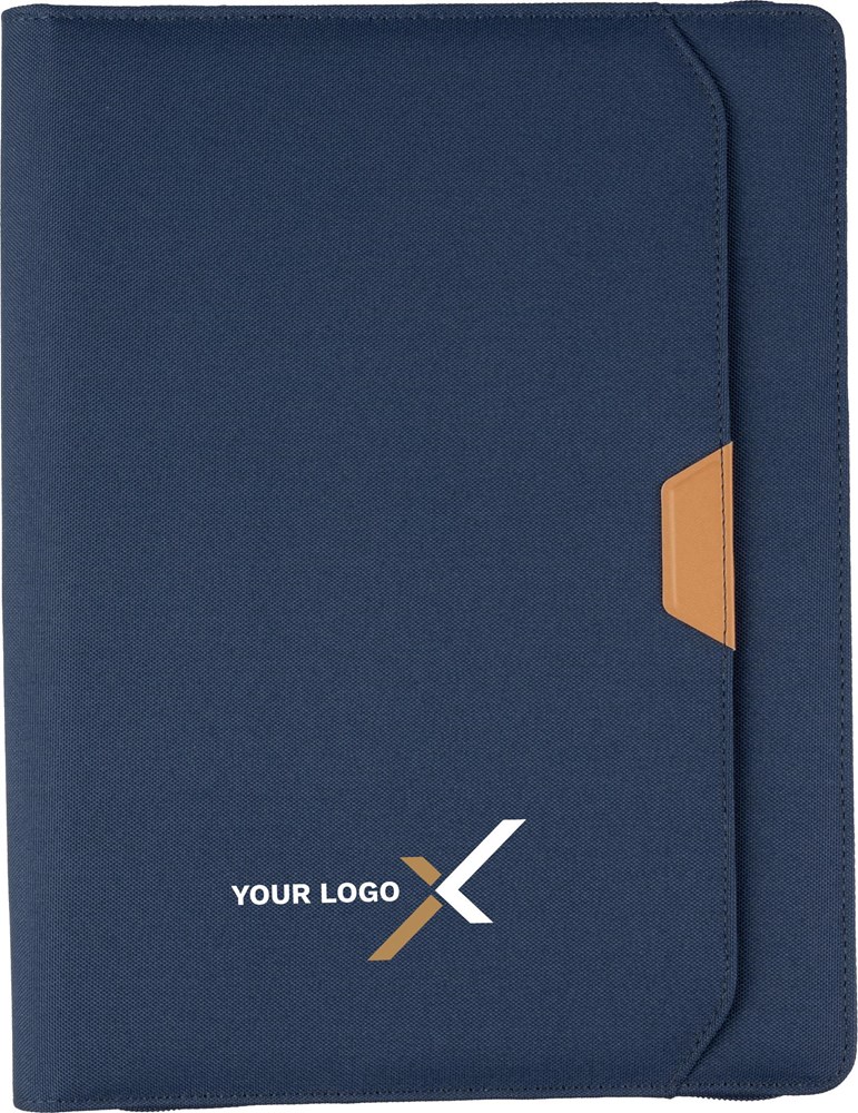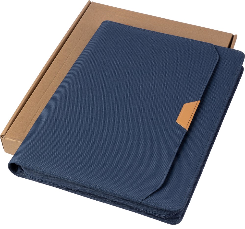 rPET-Mappe (ca. A4) mit PU-Detail und Reißverschluss. Enthält ein Notizbuch mit 20 linierten Seiten (70 g/m²), mehrere Fächer und eine Stiftschlaufe. Kleine Tasche auf der Vorderseite. Einzeln verpackt im braunen Kraftkarton.