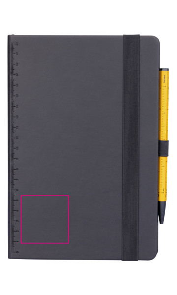 Notizblock DIN A5 inkl. Kugelschreiber, schwarzem Elastikband-Verschluss, Stiftschlaufe, Lesezeichen, geprägtes Lineal (20 cm) auf Cover, FSC zertifiziertes Papier, 64 perforierte Blätter (128 Seiten), mit schwarz eingefärbten Seitenrändern, Punktraster, Fach für Belege, Kugelschreiber CONSTRUCTION BASIC (schwarze D1 Mine), Kunstleder, Metall, matt, schwarz
