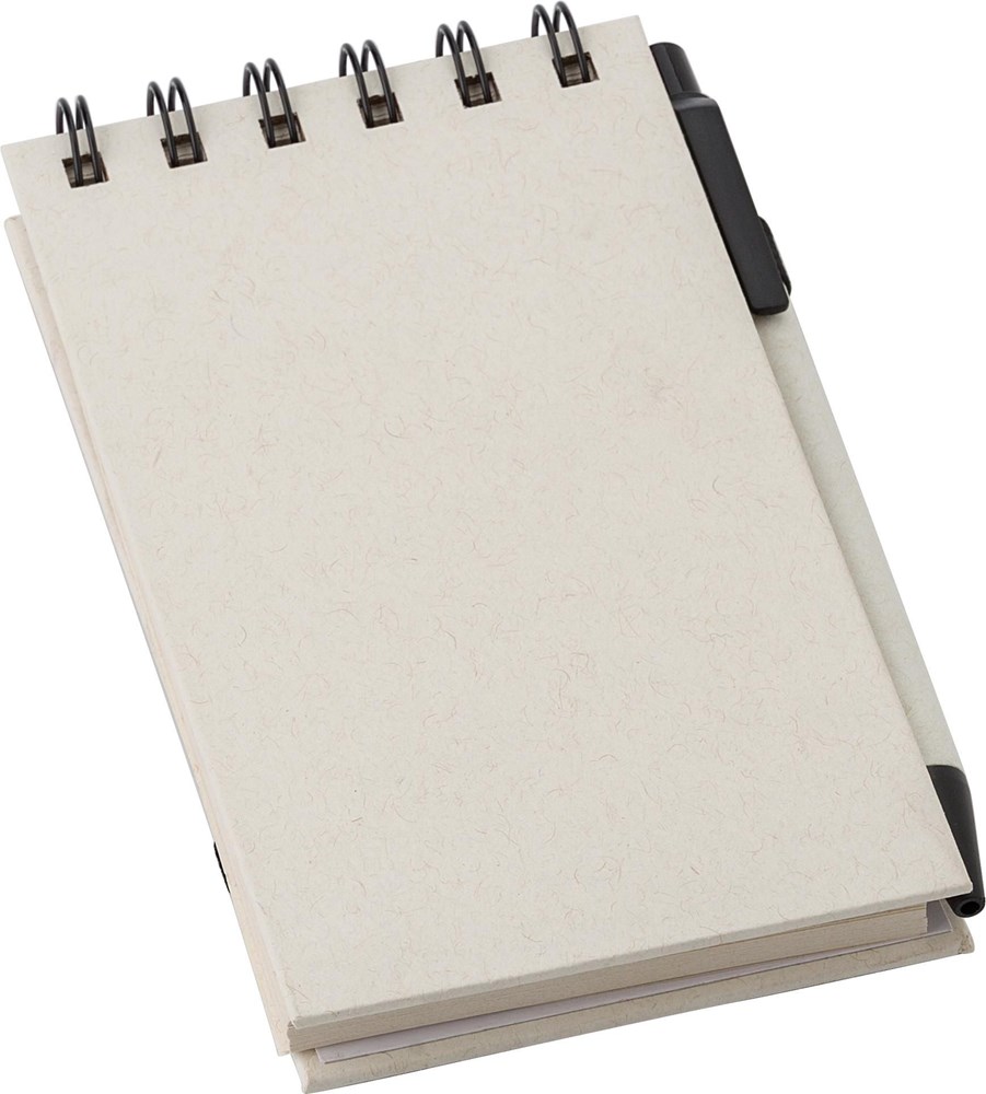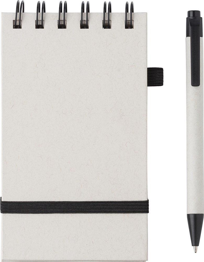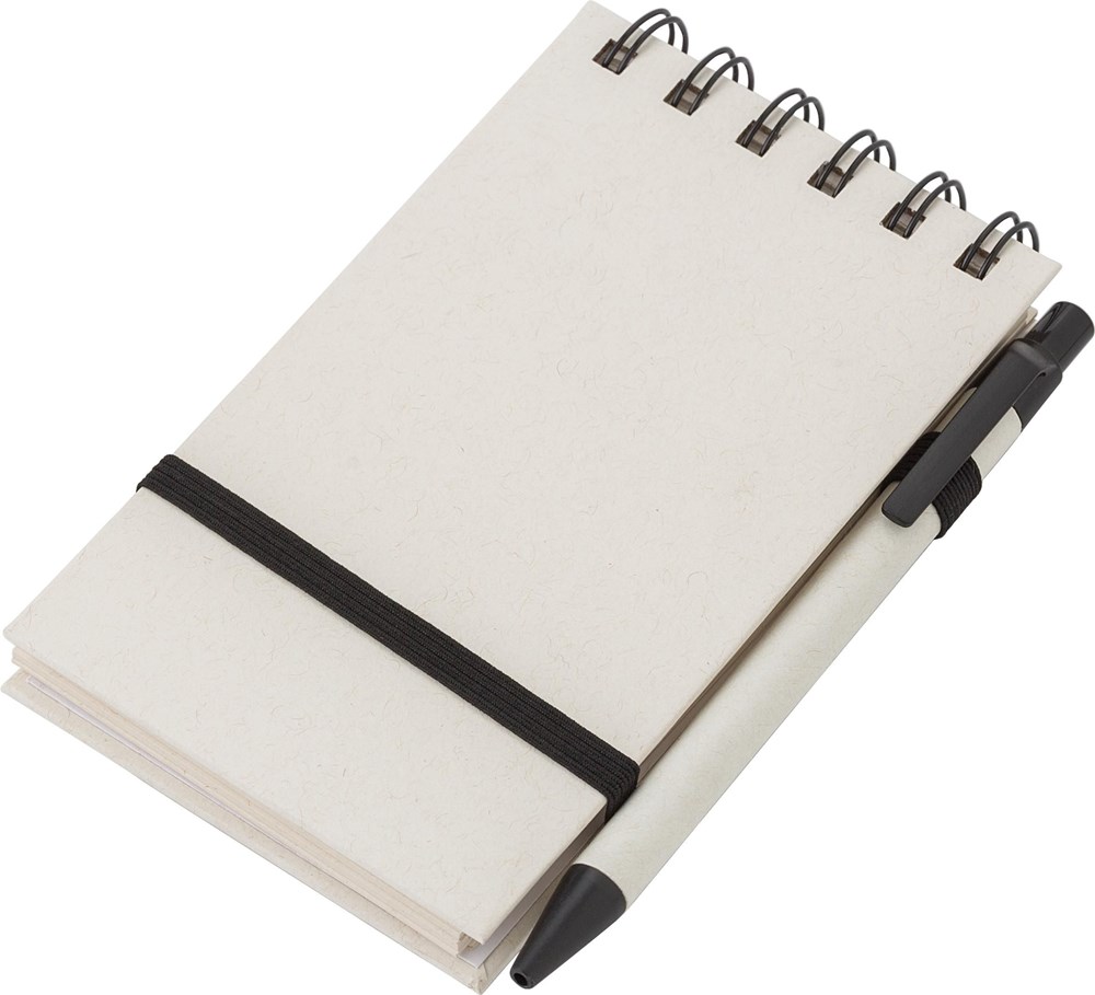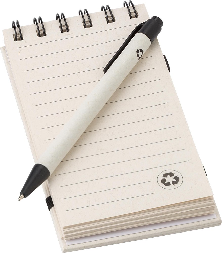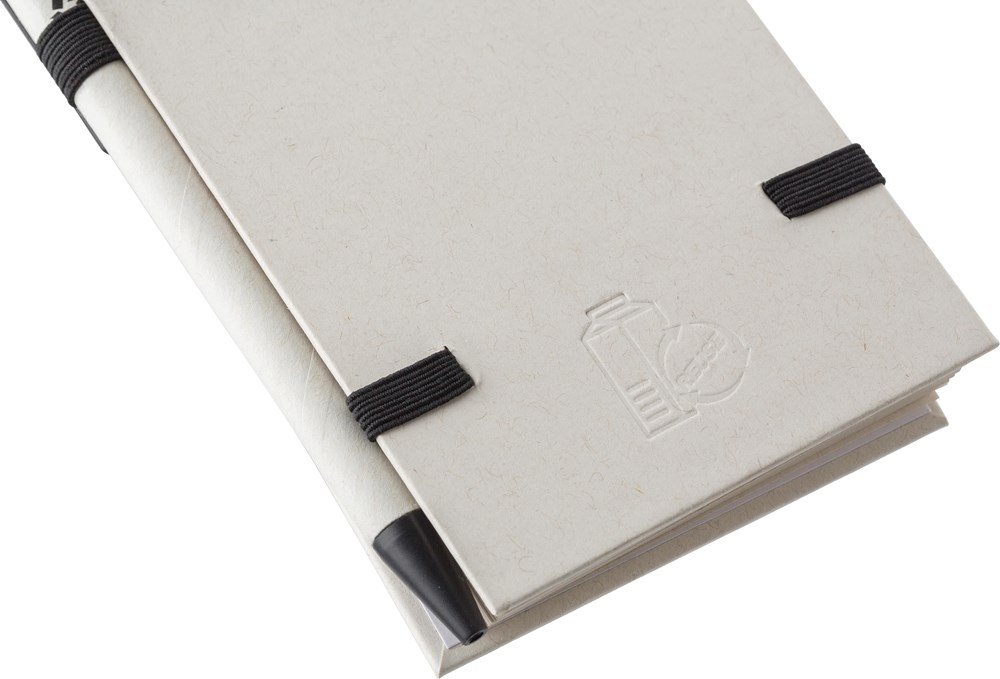 Notizbuch A6 aus recyceltem Milchkarton mit 70 Blatt, Gummiband und Stiftschlaufe. Dazu passender Kugelschreiber mit blauer Tinte. Hergestellt aus 70 % recyceltem Milchkarton und 30 % recyceltem (normalem) Papier. Mit dem Milchkarton-Stempel auf der Rückseite des Umschlags.