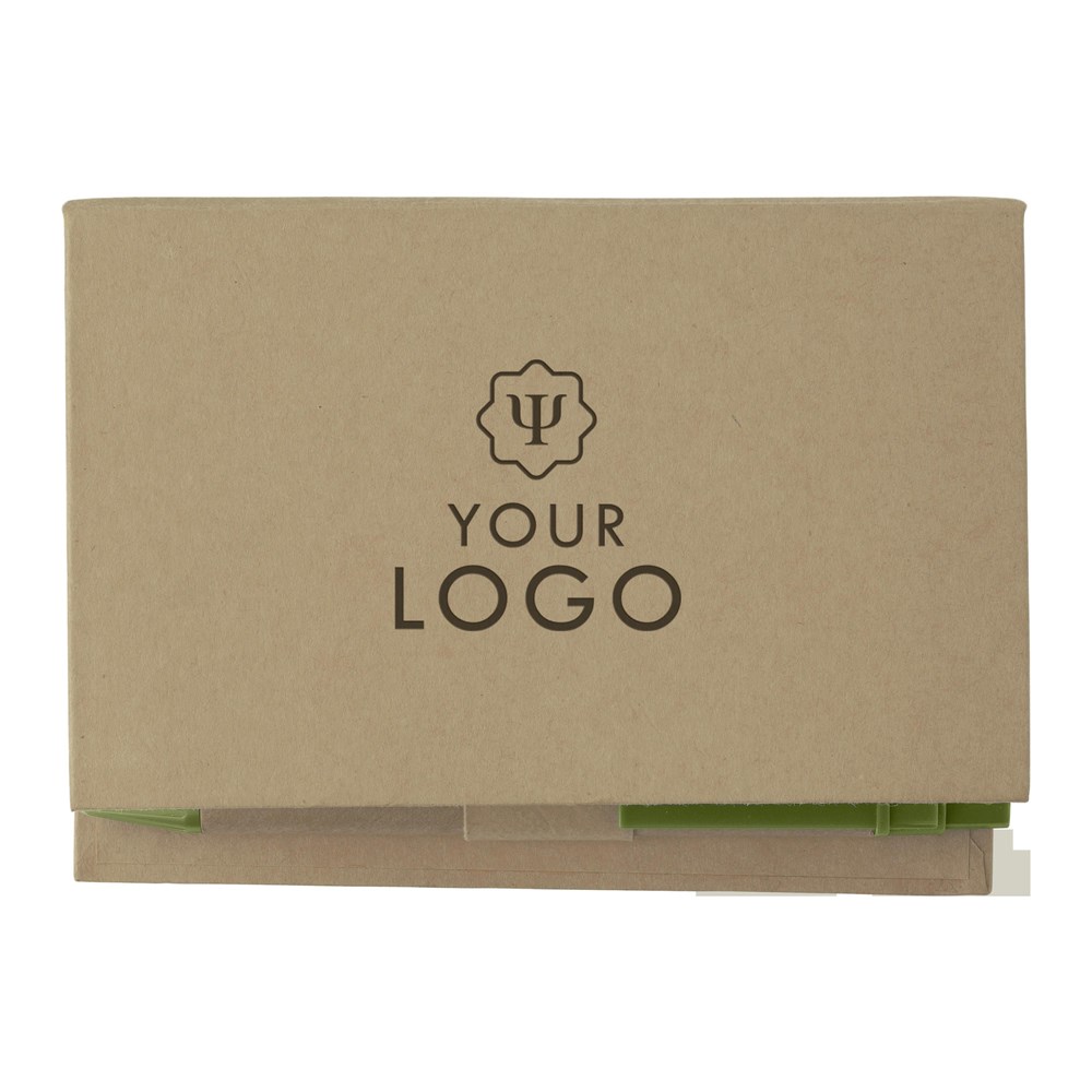 Notizzettelhalter aus Karton, mit 6x 25 Haftnotizen, 150 Notizblättern, Einsteckfach auf der Deckel-Innenseite, Linealaufdruck und Kugelschreiber aus Karton mit Applikationen aus Kunststoff und blauer Mine.