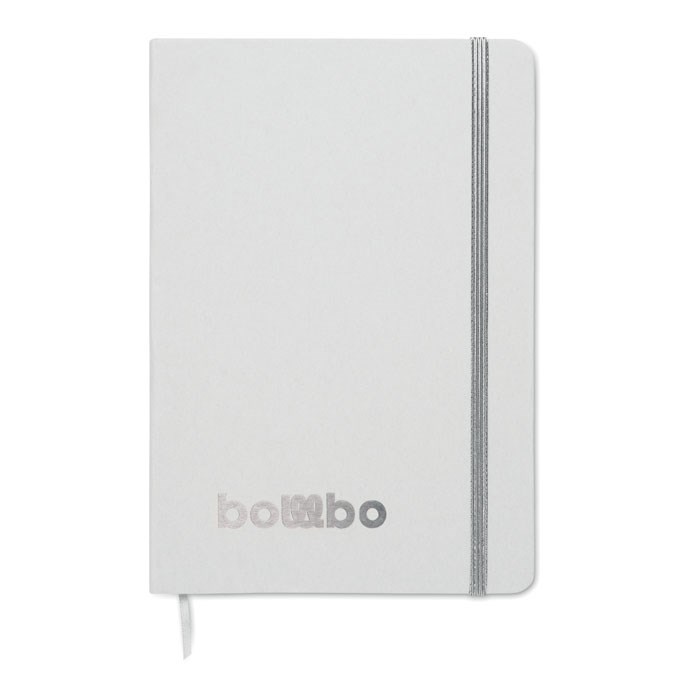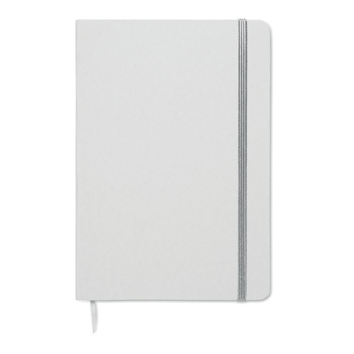 DIN A5 Notizbuch mit gebundenem Hard Cover aus 70% recyceltem Milchkarton und 30% recyceltem Papier. Weißes Cover. 80 Blatt (160 Seiten) liniertes Recyclingpapier. Nach der Gravur des Covers, wird die Farbe sichtbar. Farblich abgestimmtes elastisches Verschlussband und Lesebändchen.