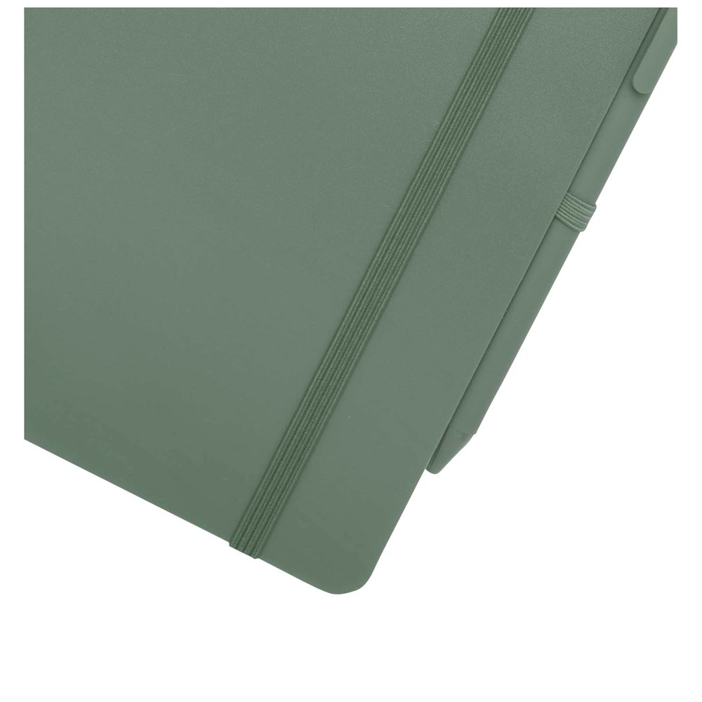 Das Thalaasa A5 Hardcover Notizbuch besteht aus recyceltem ozeangebundenem Kunststoff und umfasst 80 Blatt, liniert, aus cremefarbenem 70 g/m² Papier. Das Notizbuch hat abgerundete Ecken. Es ist mit einem elastischen Verschluss und einer Stiftschlaufe ausgestattet. Der Kugelschreiber mit schwarzer Tinte ist ebenfalls aus recyceltem, ozeangebundenem Kunststoff hergestellt. Schreiblänge: 1000 Meter. Schreibspitze: 1 mm.