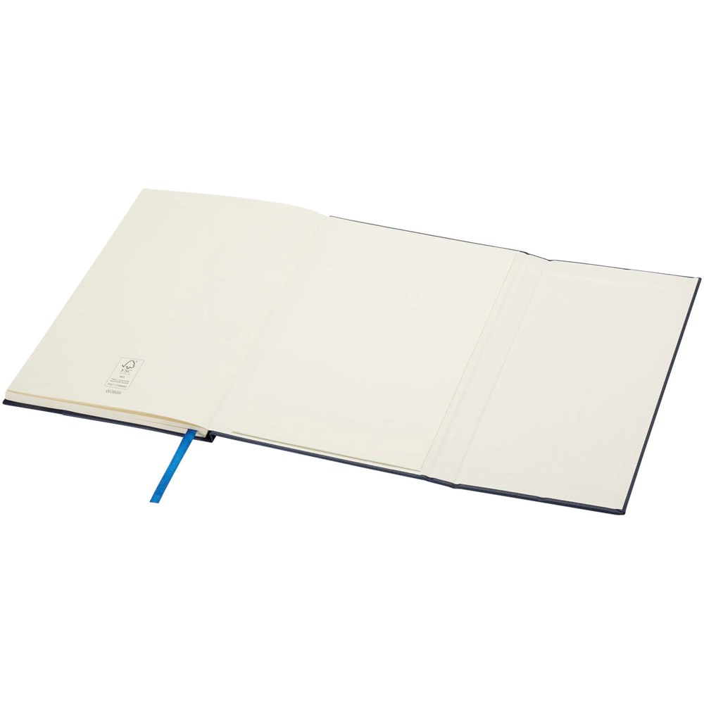 Das Alejandra A5 Hardcover Notizbuch besteht aus recyceltem PU-Kunststoff und RPET und umfasst 80 Blatt, liniert, aus cremefarbenem 70 g/m² Papier mit Lesebändchen und erweiterbarer Tasche.