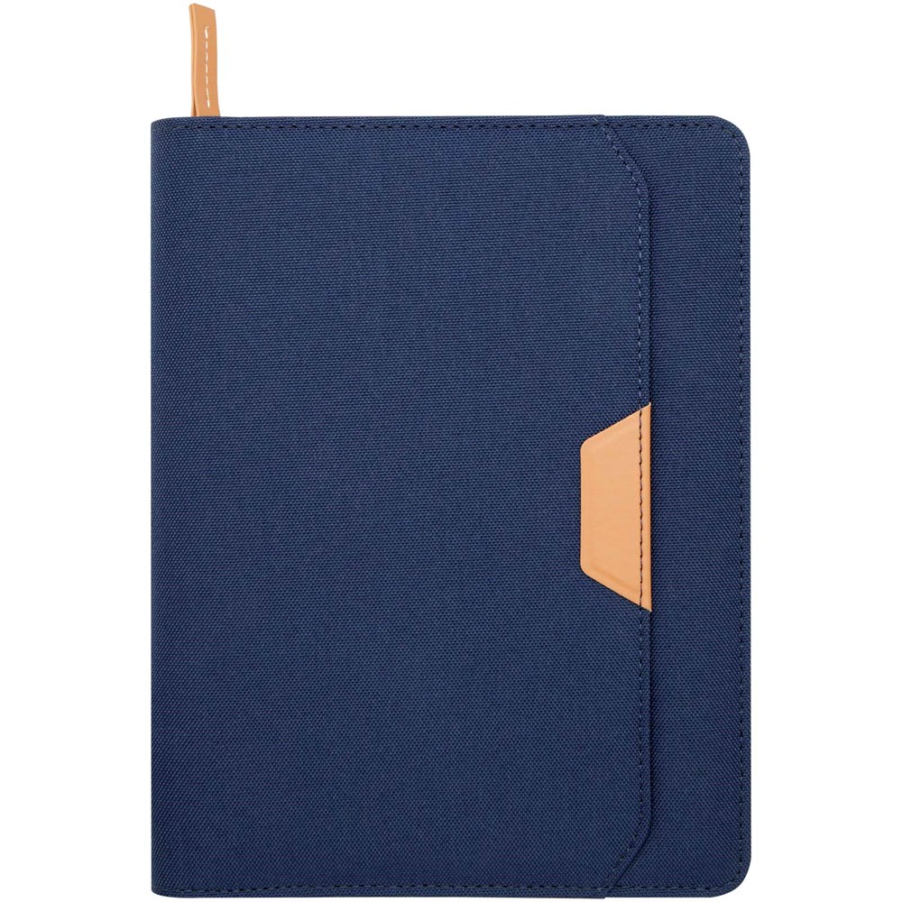 Die Nomumi A5 Mappe mit abgerundeten Ecken ist ein praktisches Büroutensil aus recyceltem Kunststoff. Die Mappe umfasst 64 cremefarbene 80 g/m2 linierte Seiten, einen Reißverschluss, eine Stiftschlaufe und eine erweiterbare Tasche.