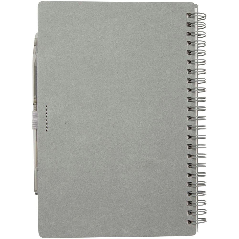 Wiederverwendbares A5 Hardcover Notizbuch und Stiftset aus Steinpapier. Das Notizbuch hat einen Einband aus Karton, abgerundete Ecken und besteht aus 32 linierten Seiten aus 120 g/m² Papier. Steinpapier ist 100 % holzfrei und der Produktionsprozess verbraucht weniger Energie als recyceltes oder neues Zellstoffpapier. Auf der Rückseite befindet sich eine Tasche für ein schwarzes Reinigungstuch (im Lieferumfang enthalten). Der radierbare Stift besteht aus recyceltem Kunststoff mit transparentem Schaft, weißem Radiergummi auf der Oberseite und einfarbigem Griff. Tintenfarbe: Schwarz. Schreiblänge: 250 Meter. Schreibspitze: 0,7 mm.