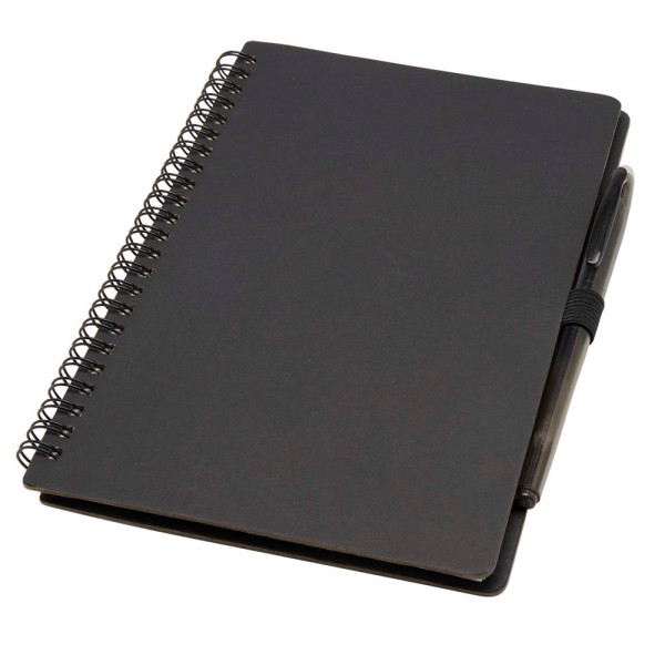 Wiederverwendbares A5 Hardcover Notizbuch und Stiftset aus Steinpapier. Das Notizbuch hat einen Einband aus Karton, abgerundete Ecken und besteht aus 32 linierten Seiten aus 120 g/m² Papier. Steinpapier ist 100 % holzfrei und der Produktionsprozess verbraucht weniger Energie als recyceltes oder neues Zellstoffpapier. Auf der Rückseite befindet sich eine Tasche für ein schwarzes Reinigungstuch (im Lieferumfang enthalten). Der radierbare Stift besteht aus recyceltem Kunststoff mit transparentem Schaft, weißem Radiergummi auf der Oberseite und einfarbigem Griff. Tintenfarbe: Schwarz. Schreiblänge: 250 Meter. Schreibspitze: 0,7 mm.
