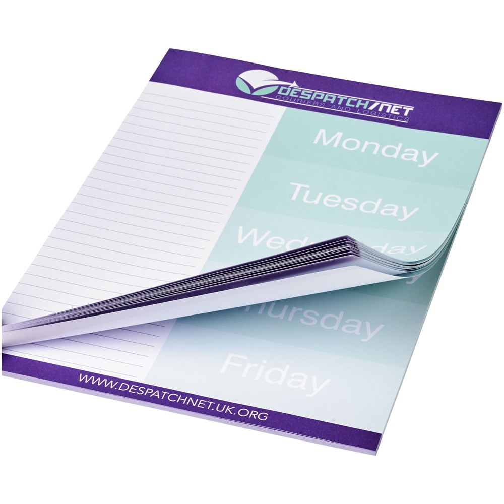 Weißer Desk-Mate® A4 Notizblock mit 80g/m2 Papier. Vollfarbdruck auf jedem Blatt möglich. Erhältlich in 3 Größen: 25, 50, 100 Blatt.