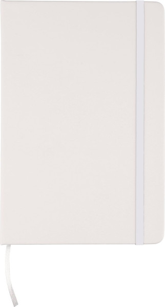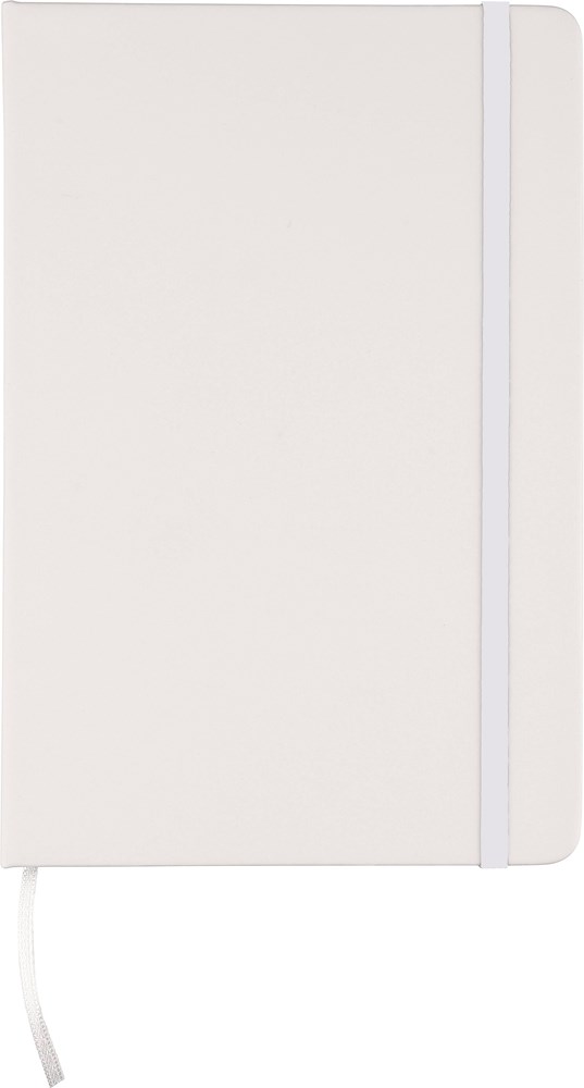 rPET-Notizbuch (ca. A5) mit hartem Einband aus rPET-PU mit 80 linierten Seiten (70 g/m2). Es verfügt über ein Gummiband und ein farblich passendes Lesebändchen. Auf der Rückseite befindet sich ein geprägtes Recycling-Logo.
