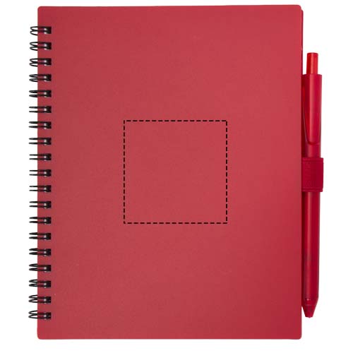Das Niove Softcover-Notizbuch besteht aus recyceltem Kunststoff und enthält 70 punktkarierte Seiten aus 70 g/m² Papier. Das Notizbuch hat abgerundete Ecken und eine Stiftschlaufe. Notizbuchformat: 140 × 178 mm. Der Kugelschreiber besteht ebenfalls aus recyceltem Kunststoff. Tintenfarbe: Blau. Schreiblänge: 1000 Meter. Schreibspitze: 1,0 mm.