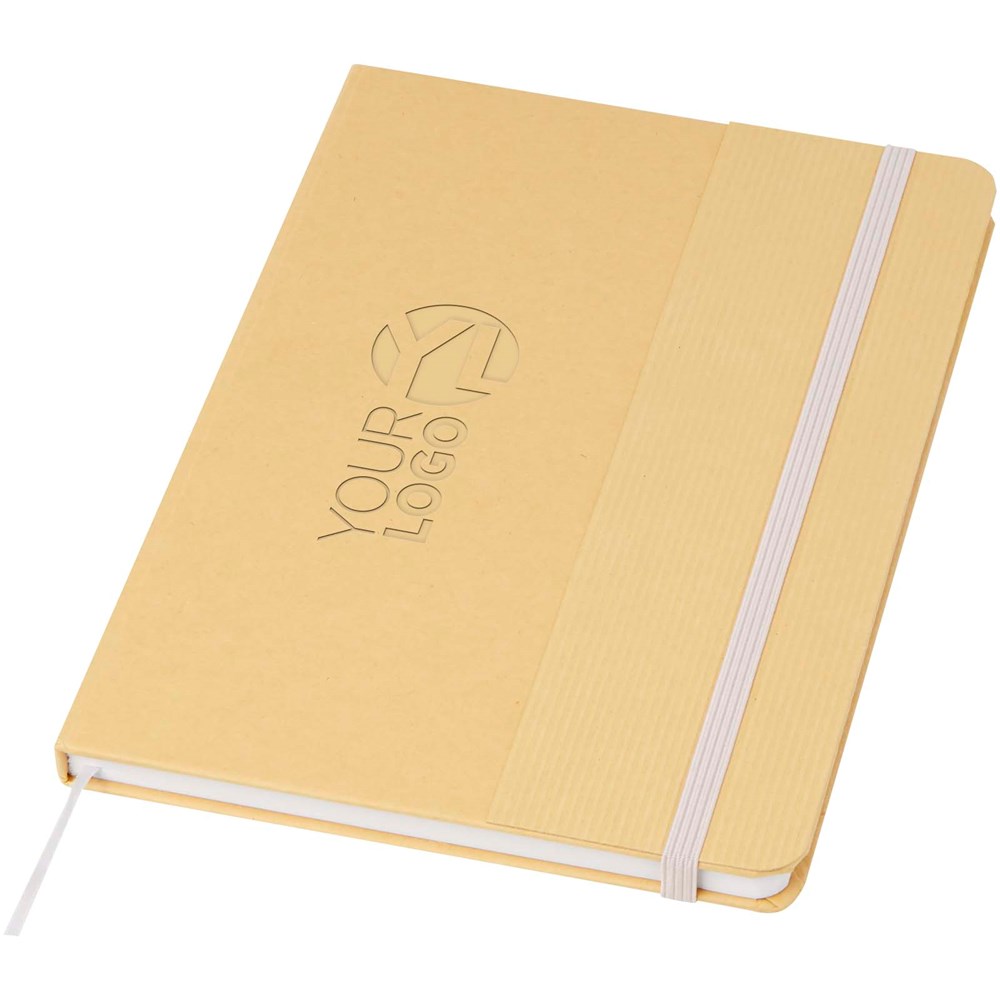 Hardcover Notizbuch im Format A5 aus recyceltem Karton mit 80 Blatt liniertem 70 g/m² Papier. Das Notizbuch hat einen elastischen Verschluss, ein Lesebändchen und abgerundete Ecken.
