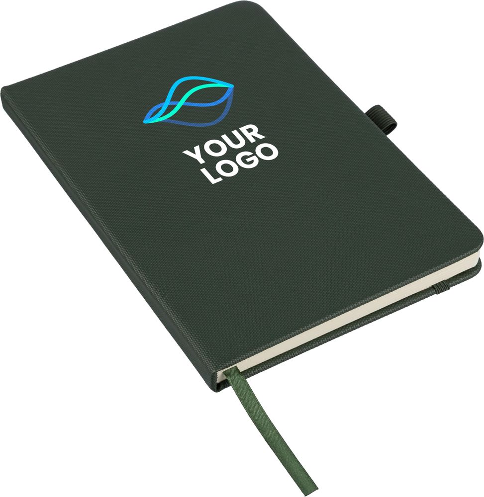 Notizbuch aus rPET-600D-Polyester mit PU-Beschichtung im Papierformat A5. Es enthält 80 Blatt liniertes Papier mit einer Grammatur von 70 g/m² und verfügt über ein Lesezeichenband, ein Gummiband sowie eine Stifthalterung. Das Cover ist halbgebunden. Auf der Rückseite ist ein geprägtes Recycling-Logo zu sehen.