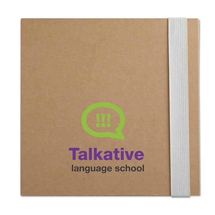 Notizbuch mit Cover aus recyceltem Karton. 100 Blatt Blankopapier, 2 unterschiedlich große, gelbe Haftnotizblöcke und 5 farbige Markerblöcke. Mit passendem Druckkugelschreiber mit Papierschaft. Stifthalter. Elastisches Verschlussband. FSC®-certified | FSC MIX, P7.1, FSC-C213206