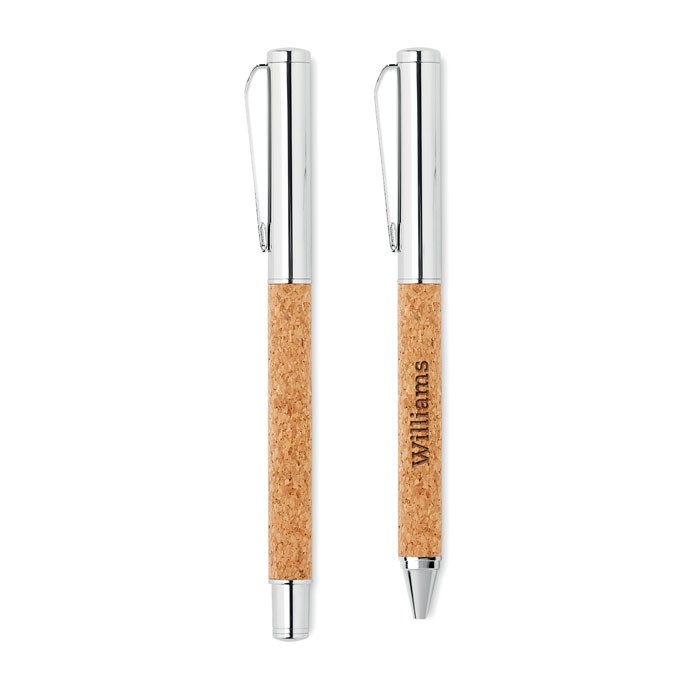 Schreibset aus Metall mit Drehkugelschreiber (blaue Tinte) und Rollerball (schwarze Tinte) mit Schaft aus Kork. Lieferung in passender Schachtel aus Kork. Kork ist ein natürliches Material, aufgrund seiner strukturellen Beschaffenheit und Oberflächenporosität kann das Druckergebnis pro Artikel Abweichungen aufweisen.
