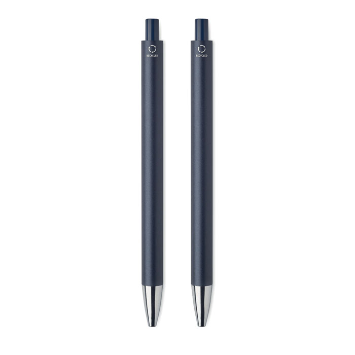 Schreibset aus recyceltem Aluminium. Bestehend aus 2 Kugelschreibern (1x blaue Tinte, 1x Graphitmiene). Präsentiert in einer Schachtel aus recyceltem Papier.