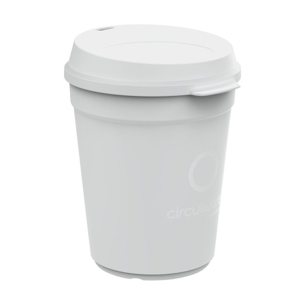 iederverwendbarer, stapelbarer Becher mit Deckel der Marke Circulware. Dieser Becher ist aus hochwertigem Kunststoff hergestellt und kann bis zu 500 Mal verwendet werden. Der stapelbare Deckel besteht zu 100% aus recycelbarem Kunststoff und schließt perfekt. Dies macht ihn zu einem idealen Becher für unterwegs. Geeignet für einen heißen Kaffee oder ein erfrischendes Getränk. Eine großartige Alternative zum Einwegbecher. Der Becher ist leicht, einfach zu reinigen und stapelbar, also platzsparend. Für Lebensmittel zugelassen. Spülmaschinengeeignet und mikrowellengeeignet. 100% recycelbar. Damit leistet dieser Becher einen Beitrag zur Kreislaufwirtschaft. Niederländisches Design. Made in Holland. Fassungsvermögen: 300 ml.