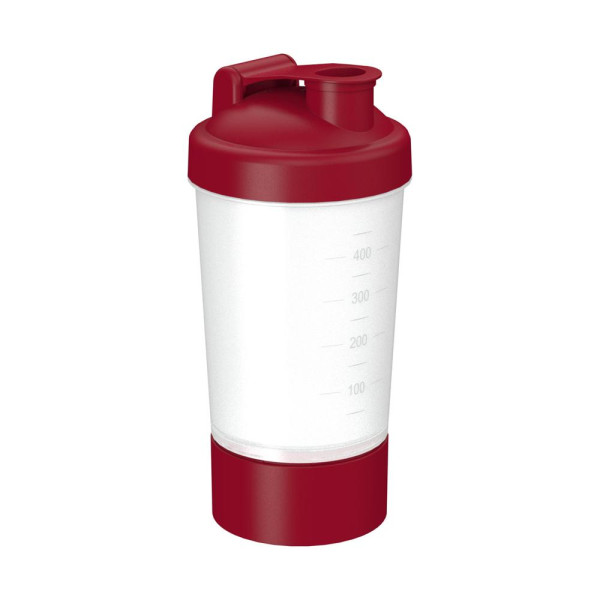 Shake it up! Ideal für den Eiweiß-Shake nach dem Training. Dieser Shaker mit geprägter Skala in 50 ml Schritten und Schraubdeckel mit verschließbarer Trinköffnung beinhaltet ein herausnehmbares Sieb, mit dem sich Shakepulver und Flüssigkeit bei gutem Schütteln optimal vermischen. Zusätzlich verfügt dieser Shaker über eine abnehmbare Kammer, welche sich separat befüllen lässt. Der Mix-Becher lässt sich komplett auseinandernehmen und somit leicht reinigen. Füllmenge (Shaker ohne Zusatzfach): 0,4 Liter.