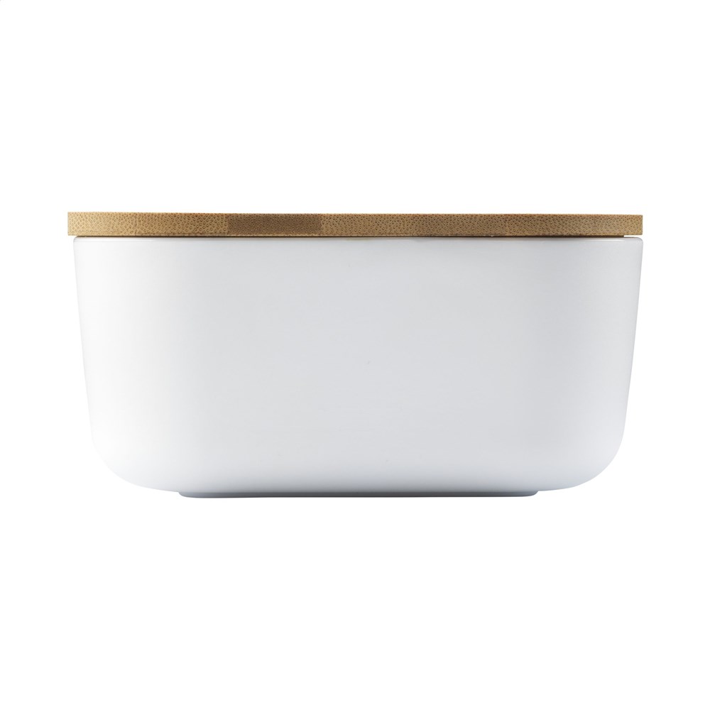 Große Lunchbox aus PP-Kunststoff. Der Deckel ist aus natürlichem Bambus gefertigt. Inklusive Gummiband zum Verschließen. Nicht spülmaschinengeeignet.