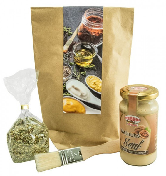 Senf: natürliches Mineralwasser, SENFschrot, Branntweinessig, Kalahari Salz, Zucker, natürliches Walnussaroma, Enthält: MILCH- und MILCHerzeugnisse, SCHALEN- und SCHALENERZEUGNISSE. Grill-Kräuter: Pfeffer, Paprika, Petersilie, Salz, Rosmarin, Oregano, Zwiebeln, Knoblauch. Nährwertangaben je 100 g: Senf: Brennwert323 kJ / 78 kcal, Kohlenhydrate 3,0g, davon Zucker 3,0 gFett 5,1 g, davon gesättigte Fettsäuren 0,3 g, Eiweiß 4,9 g, Salz 2,3 g. Grill-Kräuter: Energie 1214 kJ / 290 kcal, Fett 3,5 g, davon gesättigte Fettsäuren 0,7 g, Kohlenhydrate 40 g, davon Zucker 34 g, Eiweiß 13 g, Salz 7,4 g. |