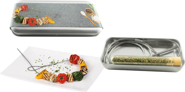 Edel und nachhaltig sind sowohl die Dose als auch unser Edelstahl-Grilldraht. Sie sind wiederverwendbar und auch optisch ein Blickfang. Zum Marinieren der Grillstücke werden Grillkräuter mitgeliefert. Die Banderole bietet viel Platz für Ihre Werbebotschaft oder, ebenfalls ab 100 Stück, für Ihre individuelle Gestaltung. Inhalt: Grilldraht und, 5 g Grillkräuter