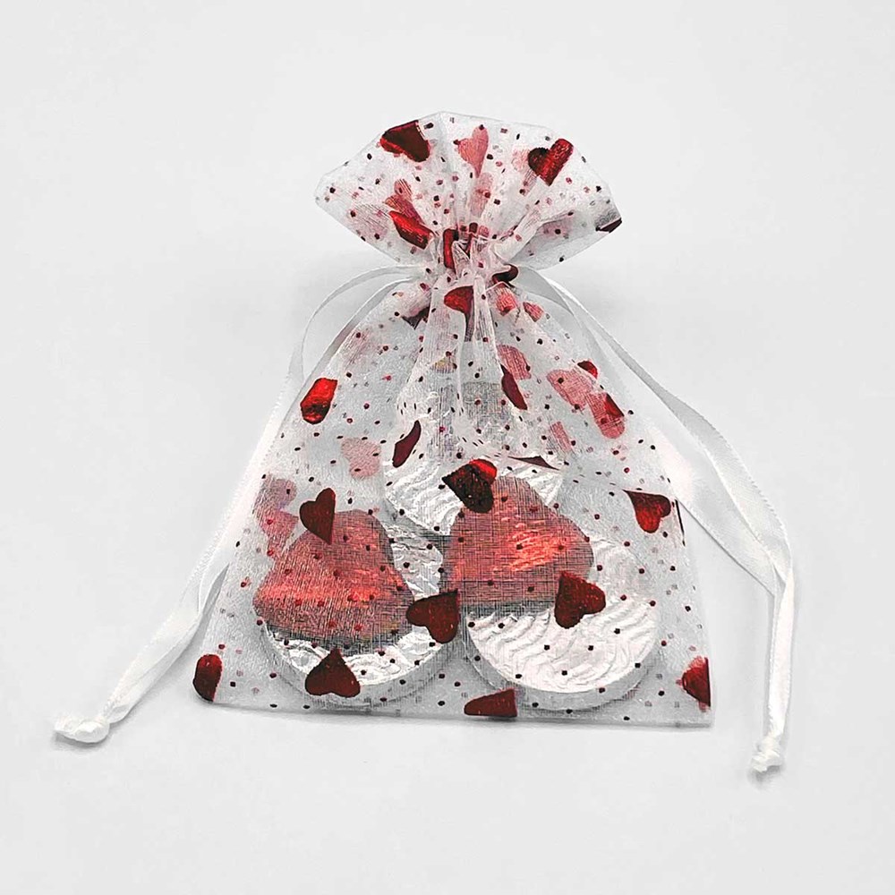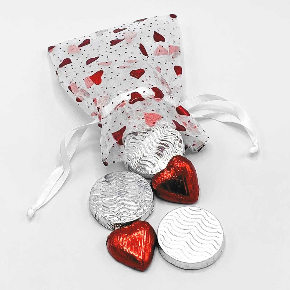 Organzasäckchen "IN LOVE" . Unser Organzasäckchen IN LOVE ist ein echter Gaumenschmaus und sorgt beim Beschenkten ganzjährig für große Freude - hier gilt: vielseitig einsetzbar und bester Geschmack. Das Organzasäckchen wird mit drei Vollmilch-Schokotalern und zwei Edelvollmilch-Herzen aus dem Hause Heilemann befüllt. Eine Werbebotschaft ist mittels 4c Grußkärtchen möglich. Ihrem individuellem Design sind hier keine Grenzen gesetzt. Nutzen Sie bei diesem Produkt unseren flexiblen Abrufservice.