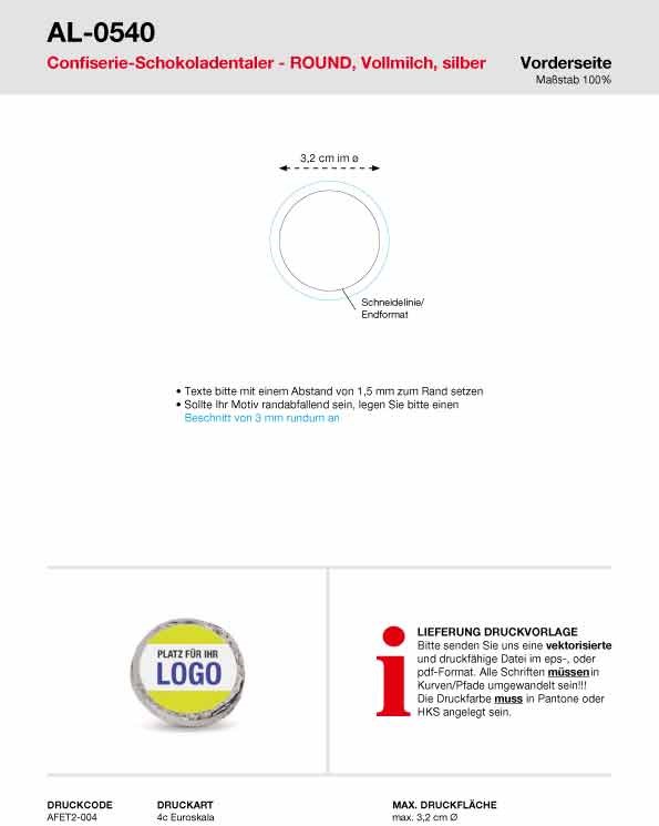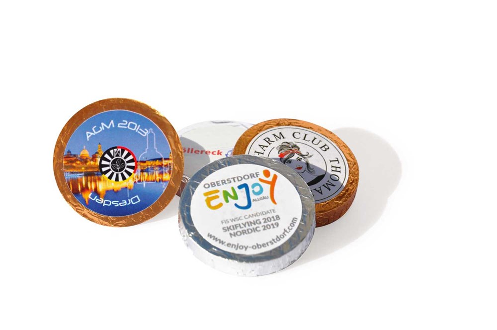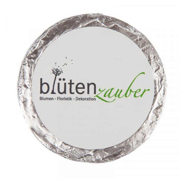 Klein und fein - süßes Werbemittel aus deutscher Produktion, hochwertige Confiserie-Schokoladentaler aus bester Vollmilchkuvertüre. Toller Streuartikel, der schon ab kleinen Mengen umsetzbar ist. Die frisch produzierten Taler können wahlweise in goldener oder silberner Folie gewickelt werden und sind in den Geschmacksrichtungen Vollmilch oder Zartbitter erhältlich. Nutzen Sie bei diesem Produkt unseren Abrufservice.