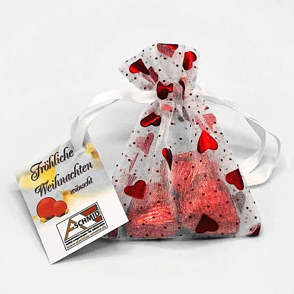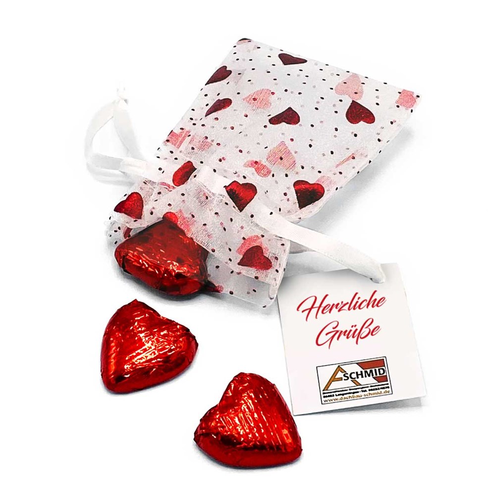 Organzasäckchen "YOUR HEART". Unser Organzasäckchen YOUR HEART ist ein echter Gaumenschmaus und sorgt beim Beschenkten ganzjährig für große Freude - hier gilt: vielseitig einsetzbar und bester Geschmack. Das Organzasäckchen wird mit drei Vollmilch-Schokotalern und zwei Edelvollmilch-Herzen aus dem Hause Heilemann befüllt. Sie können die Motive der Schokotaler-Etiketten selbst gestalten, dazu benötigen wir Ihre druckfähigen Daten. Eine Werbebotschaft ist mittels 4c Grußkärtchen möglich. Ihrem individuellem Design sind hier keine Grenzen gesetzt. Nutzen Sie bei diesem Produkt unseren flexiblen Abrufservice.