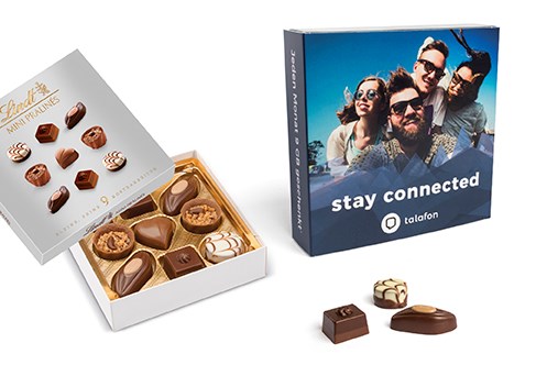 9 köstliche Lindt Mini Pralinés in kleiner Pralinenschachtel mit individuellem Werbeschuber. mehr