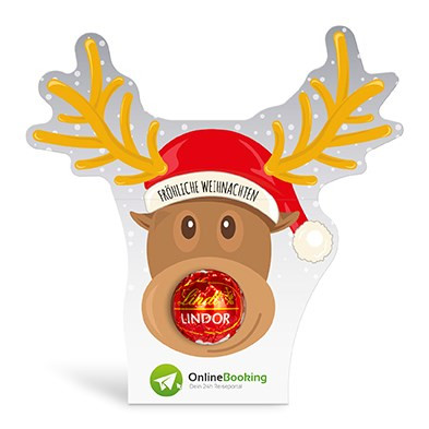 Zartschmelzender Genuss trifft charmantes Design: Feinste Lindor Kugel aus Milch- oder feinherber Schokolade, verpackt in einer individuell bedruckbaren Rentier-Klemmkartonage aus FSC-zertifiziertem Karton. Nachhaltige Süßigkeit mit Werbewirkung!