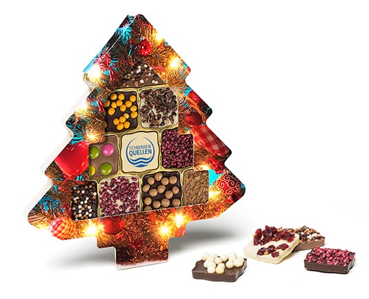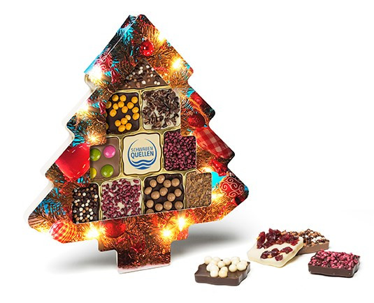 11 feine Schokoladentäfelchen aus Vollmilch-, Zartbitter- und weißer Schokolade – veredelt mit verschiedenen Toppings und liebevoll arrangiert im Display mit weihnachtlicher Standard-Kartonage in Baumform. Mit Logodruck auf einem Täfelchen – süße Werbung, die begeistert!