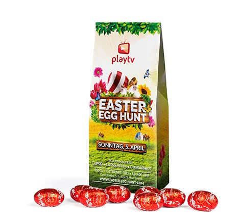 Feinste Lindt Lindor Ostereier aus Milchschokolade in individuell bedruckter Standboden-Kartonage. mehr