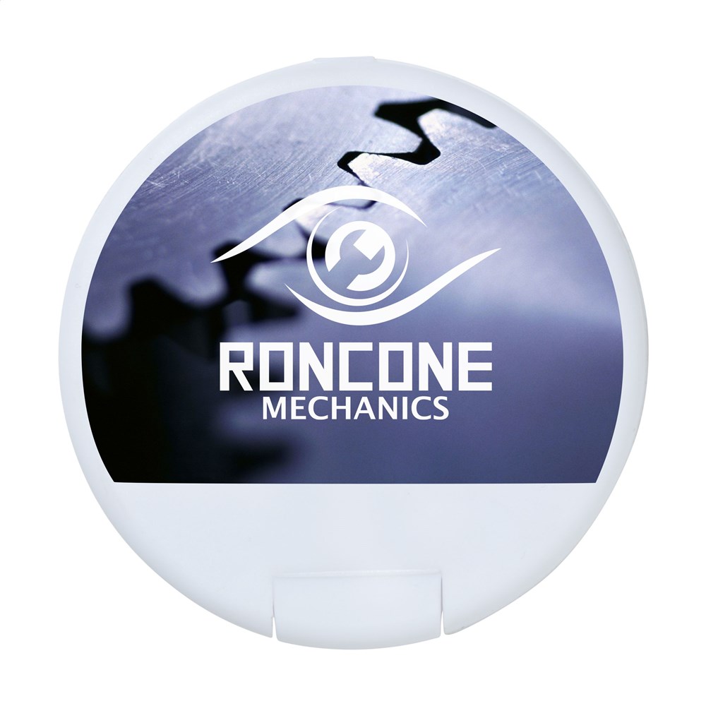 Runder Kunststoff-Spender gefüllt mit ca. 12 Gramm (ca. 55 Stück) frischen, zuckerfreien Pfefferminz.