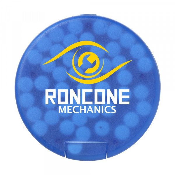 Runder Kunststoff-Spender gefüllt mit ca. 12 Gramm (ca. 55 Stück) frischen, zuckerfreien Pfefferminz.