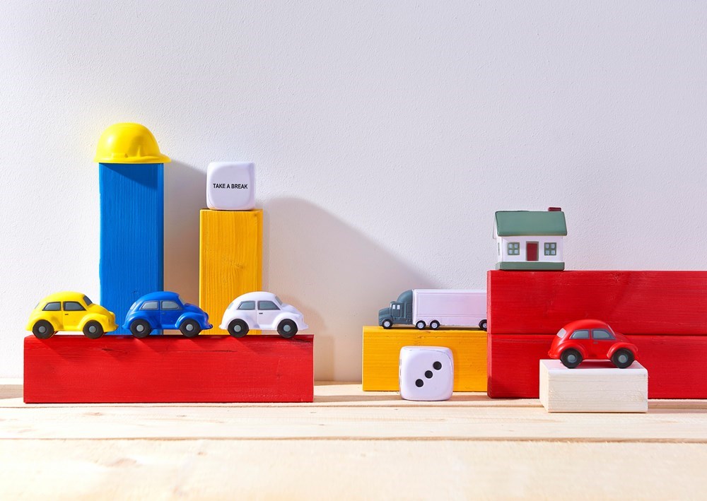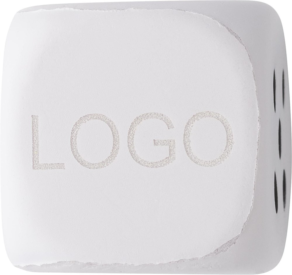 Anti-Stress Würfel aus PU Schaum, mit einer leeren Seite für die Werbeanbringung. Anti-Stress-Artikel können nur in den Farben Schwarz, Weiß, gold oder Silber bedruckt werden.