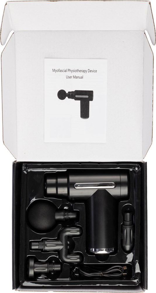 ABS-Massagepistole mit Bürstenmotor (Geschwindigkeit 1.800 - 3.200 U/min) und 1.200 mAh Akku. 5V Eingang und 6 Intensitätsstufen, um die Muskeln zu massieren. Individuell pro Stück in einer Geschenkbox verpackt, einschließlich 4 Massageköpfe.