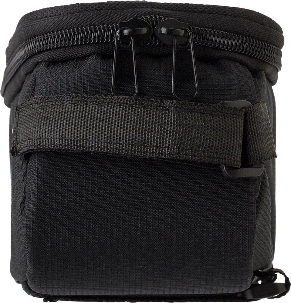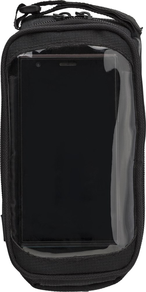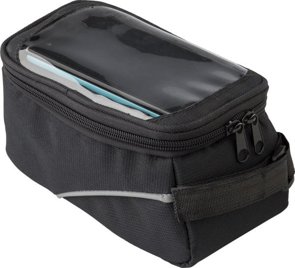 Fahrradlenkertasche aus Polyester (600D) und PVC mit separatem Fach an der Oberseite für ein Mobiltelefon. Der Touchscreen des Telefons kann durch die PVC-Abdeckung weiterhin benutzt werden.