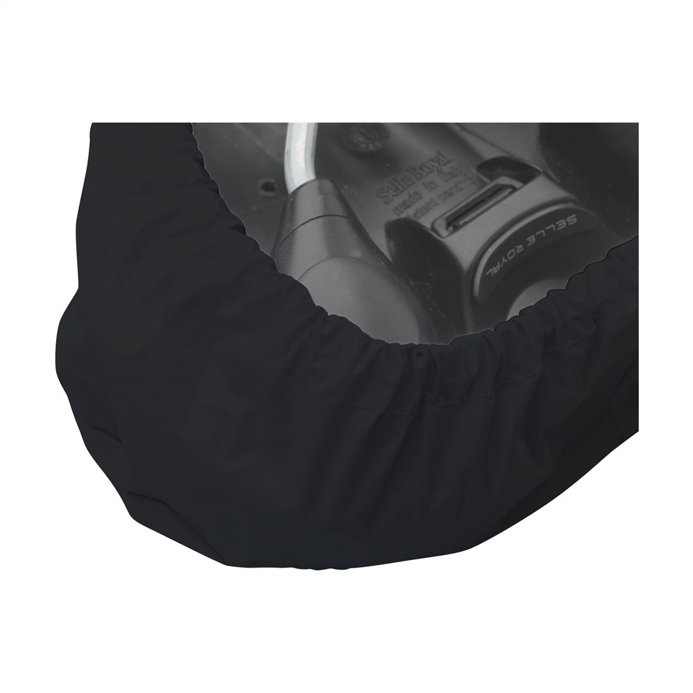Sattelüberzug aus recyceltem PVC (60% recyceltes PVC und 40% reines PVC). Jeder Sattelüberzug ist innen mit einer Pappfolie versehen, damit er nicht knittert. Das Gummiband unten ist bei diesem Modell nicht sichtbar, es ist sauber verarbeitet. Der Bezug schützt den Sattel vor Schmutz und Feuchtigkeit (nicht 100% wasserdicht).