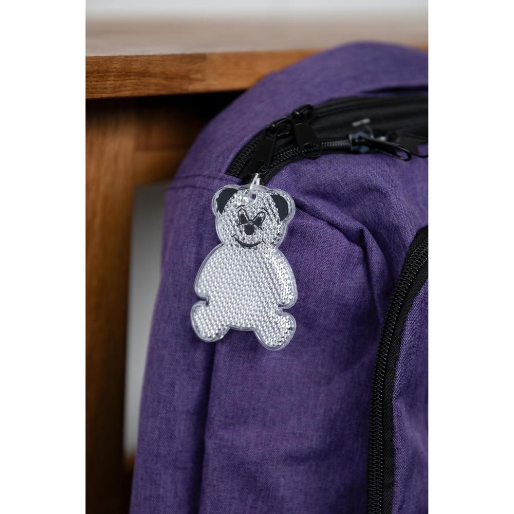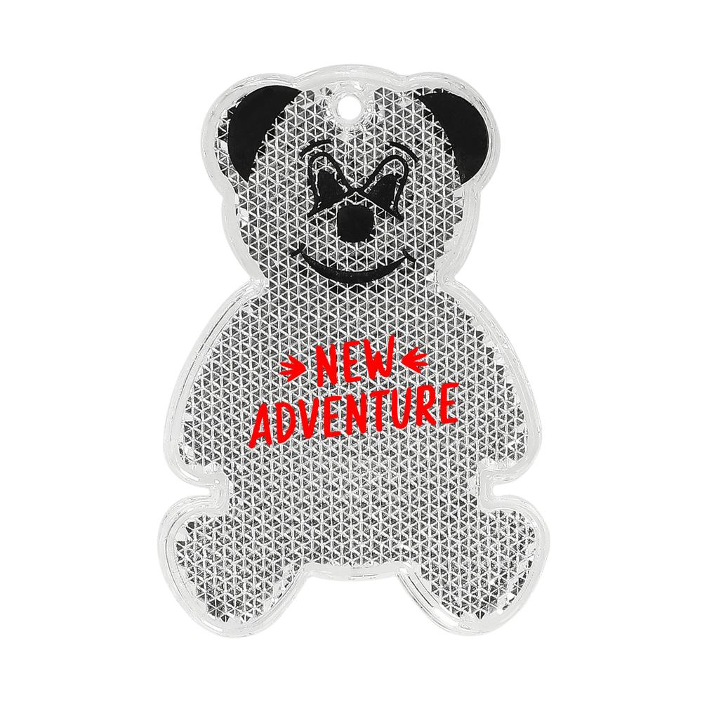 Reflektor in Form eines Bärs. Mit Öse und Schnur. Inklusive Konturendruck (Anstelle des Konturendrucks ist auch ein einfarbiger Kundendruck möglich). Bei diesem Artikel handelt es sich um einen reflektierenden Werbeanhänger.