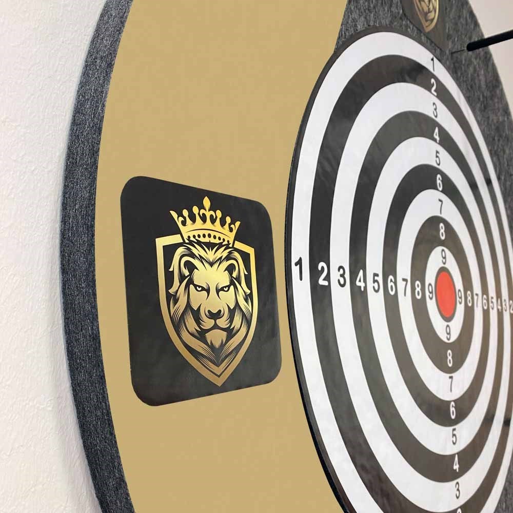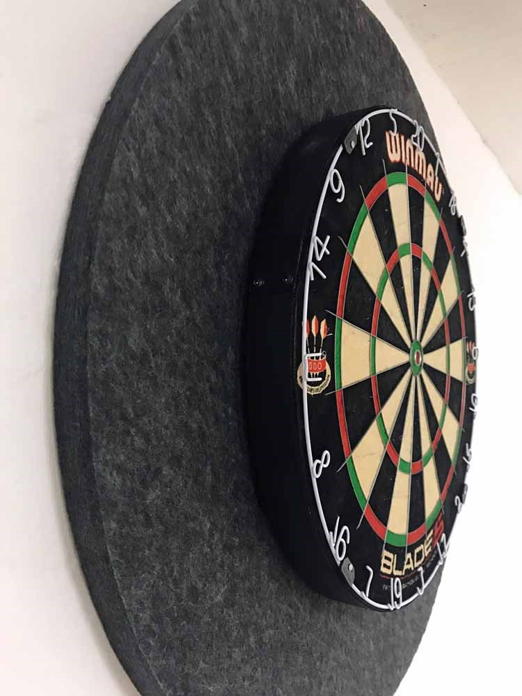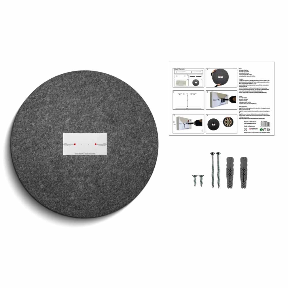 Schallschutz für Dartboards. Signifikante Reduzierung von Geräuschen im Raum hinter dem Dartboard. Eine stabile schallschluckende Montageplatte dient zur schallentkoppelnden Aufnahme des Dartboards. Der Catchring/Surround ist aus schallschluckenden Material für Steeldarts. Der Catchring ist sichtbar und kann nach Wunsch gestaltet werden. Unser Catchring wird über die Montageplatte gesteckt. Die Montageplatte ist mit 2 Senkbohrungen versehen und inkl. Befestigungsmaterial. Ist bei schwierigen Platzsituationen auch mit einem Cuttermesser zu bearbeiten.