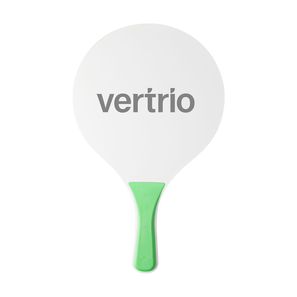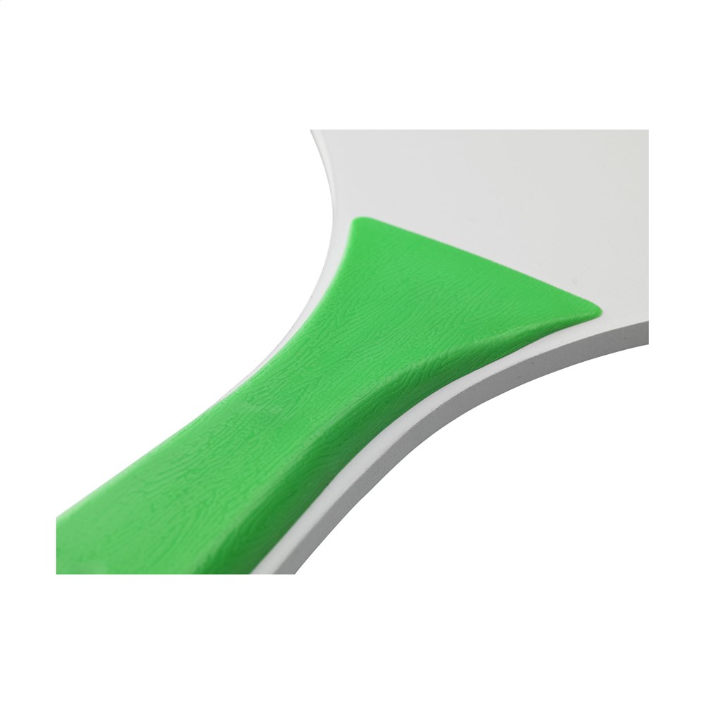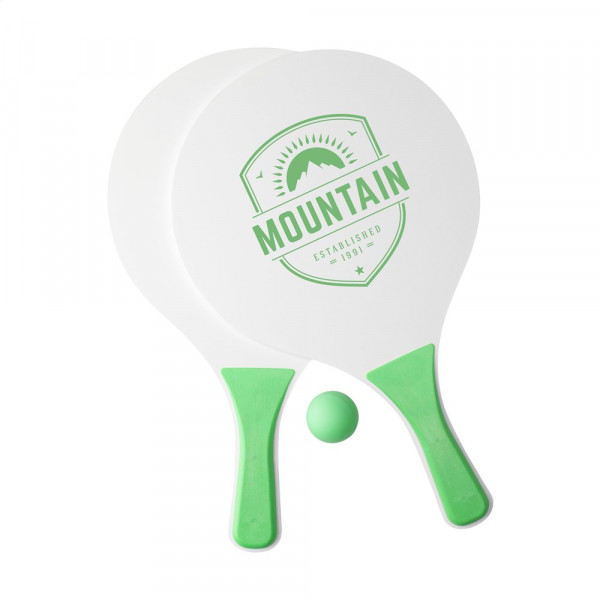 Sportliches Strandset: 2 Schläger aus MDF-Holz mit PP-Kunststoffgriffen und Gummiball. Pro Set in einem Netz zur Aufbewahrung. ACHTUNG: Bei einem 2-Farbendruck auf den Schlägern ist keine perfekte Passgenauigkeit möglich - dies ist nur gewährleistet, wenn sich die Farben nicht berühren.